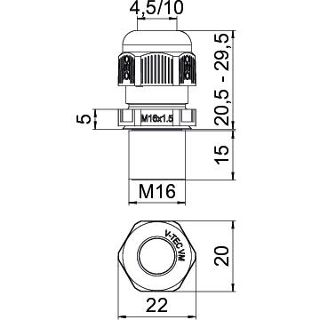 bez halogena da Boja crno CO2 otisak (GWP) od kolijevke do vrata 0,0391 kg CO2e / 1 Komad Dimenzija L maks. 29,5 mm Dimenzija L min. 20,5 mm Dimenzija M16 Djeljiva kabelska uvodnica ne Duljina navoja 15 mm Izvedba ravno Kabelska uvodnica za plosnati kabel ne Materijal Poliamid Mjera e 22 mm Mjera L1 15 mm Mjera L2 5 mm Mogućnost rasterećenja da Navoj M16 x 1,5 Navojni uspon 1,5 mm Nazivna veličina navoja 16 Nepropusno područje D, maks. 10 mm Nepropusno područje D, min. 4,5 mm Nestabilan zakretni moment 2,5 Nm ojačano staklenim vlaknima ne otporno na udarce ne S protumaticom ne Šesterokut 22 mm Širina ključa 20 Stupanj zaštite IP68 Temperaturno područje korištenja, maks. 65 °C Temperaturno područje korištenja, min. -20 °C vatrootporan prema VDE 0471/DIN 695 dio 2-1, temperatura ispitivanja 650°C Višestruka brtva ne Vrsta brtve Brtveni prsten Vrsta navoja metrički Za Ex-područje bez za EX-područje plin bez za EX-područje prašina bez zaštićeno od eksplozije ne Zaštita od savijanja ne  - Svi tipovi