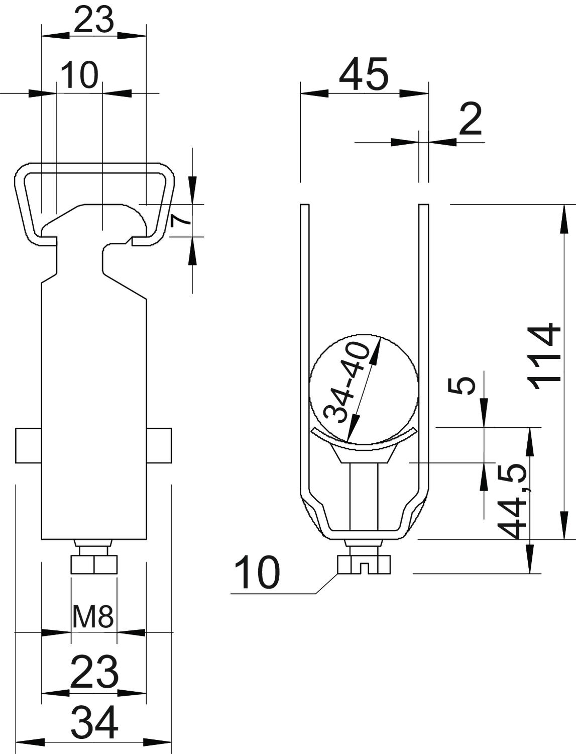 bez halogena da Broj kablova/cijevi 2 CO2 otisak (GWP) od kolijevke do vrata 0,2024 kg CO₂e / 1 Komad Dimenzija 34-40mm Dodatak materijala Čelik Dodatak površine F vruće pocinčano Kvaliteta materijala kade Polipropilen Maks. Zakretni moment 5 Nm Materijal Čelik Materijal kade Plastika Mjera A 23 mm Mjera B 45 mm Mjera C 34 mm Mjera G (mm) M8 Mjera H 114 mm Mjera L 44,5 mm Mjera t 2 mm Mjera x 6 mm Način montaže Montažni profil otporno na udarce ne Područje zatezanja D maks. 40 mm Područje zatezanja D min. 34 mm Površina vruće pocinčano S metalnom pločicom ne S plastičnom posudom da Sa nasuprotnom pločicom ne za montažni profil sa širinom proreza (s intervalom) maks. 17 mm za montažni profil sa širinom proreza (s intervalom) min. 16 mm - Svi tipovi