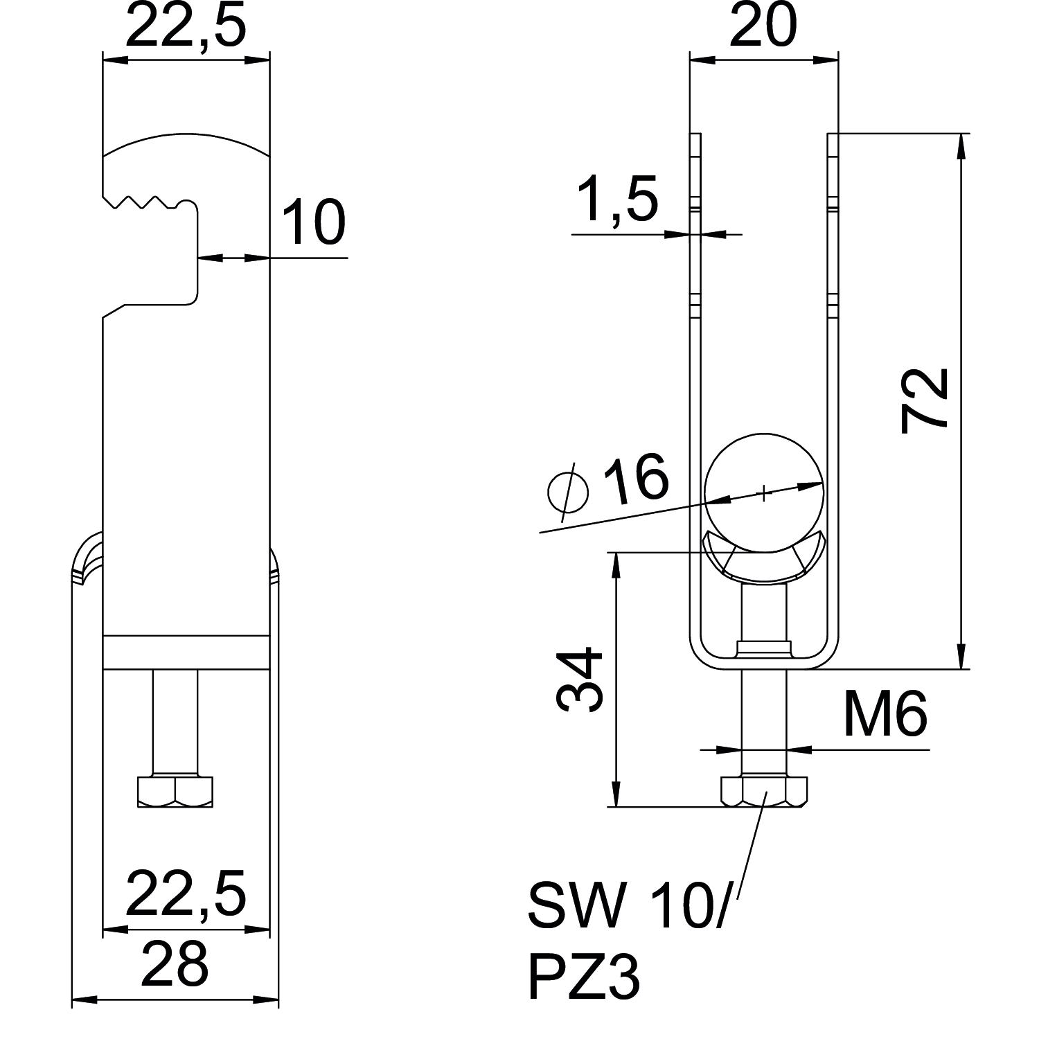 bez halogena da Broj kablova/cijevi 2 CO2 otisak (GWP) od kolijevke do vrata 0,1487 kg CO2e / 1 Komad Debljina lima 1,5 mm Dimenzija 12-16mm Dodatak materijala Čelik Dodatak površine F vruće pocinčano Duljina 22,5 mm Dužina vanjske mjere 28 mm Maks. Zakretni moment 3 Nm Materijal Čelik Materijal kade Čelik Mjera A 22,5 mm Mjera B 20 mm Mjera C 28 mm Mjera G (mm) M6 Mjera H 72 mm Mjera L 34 mm Mjera t 1,5 mm Način montaže plosnati profil Navoj M6 Područje zatezanja D maks. 16 mm Područje zatezanja D min. 12 mm Površina vruće pocinčano S metalnom pločicom da Sa nasuprotnom pločicom ne Širina 20 mm Širina utora 10 mm Visina 72 mm za maks. promjere cijevi 16 mm za min. promjere cijevi 12 mm - Svi tipovi