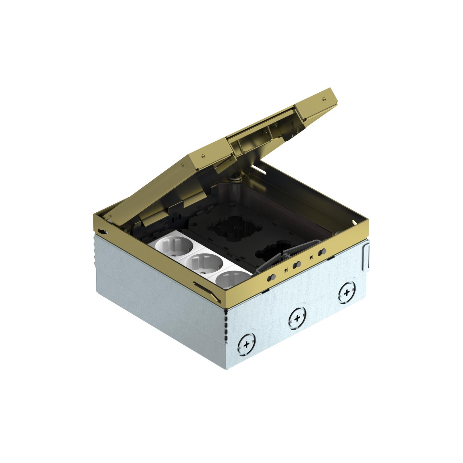 Opis proizvodaKvadratna podna kutija za primjenu u suho održavanim šupljim podovima i podovima s glazurom u unutrašnjosti. Kućište s utisnutim otvorima za cijevi (M25). Okvir kutije nivelira se s pomoću 4 nivelacijske nožice u ravnini s podnom oblogom. Minimalna dubina za ugradnju je 95 mm, područje niveliranja + 30 mm.