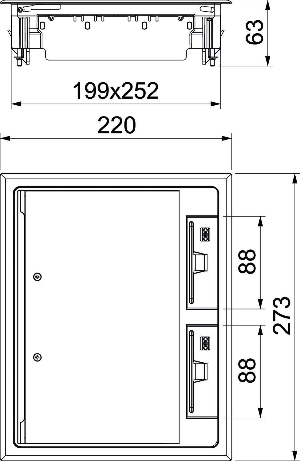 Opis proizvodaUgradni okvir s poklopcem i ručicom, za ugradnju 9 pojedinačna elektroelementa Modul 45 u 3 univerzalna nosača UT3, primjena u sustavima podnih kanala u zatvorenom prostoru.